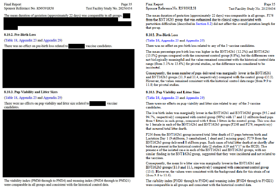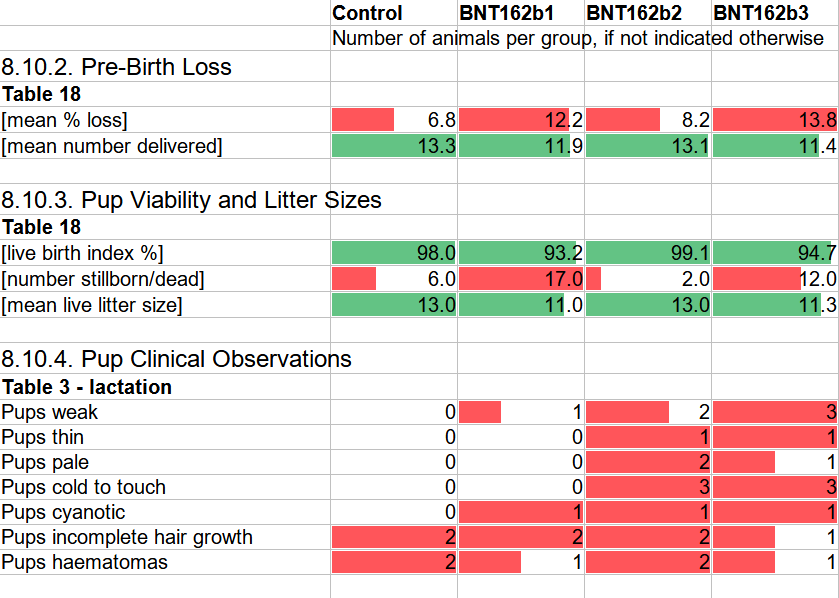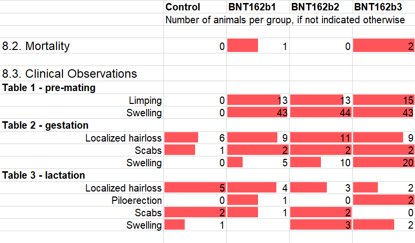 I will spare you (and myself) the other details on the test setup and procedures, and jump right into the results from Section 8 (page 30 onwards) of the final report. A first set of results concerns the first generation of rats (mothers). Section 8.2 Mortality indicated that three animals died prematurely, all in the vaccine groups. The researchers consider these unscheduled death incidental with reference to historical control data. Two of the three deaths were in animals removed from the study after total litter loss. To put these into context, the report refers to cases of total litter loss in a mere two out of 18 other studies conducted between 2015 and 2019. That does not look very convincing to me.