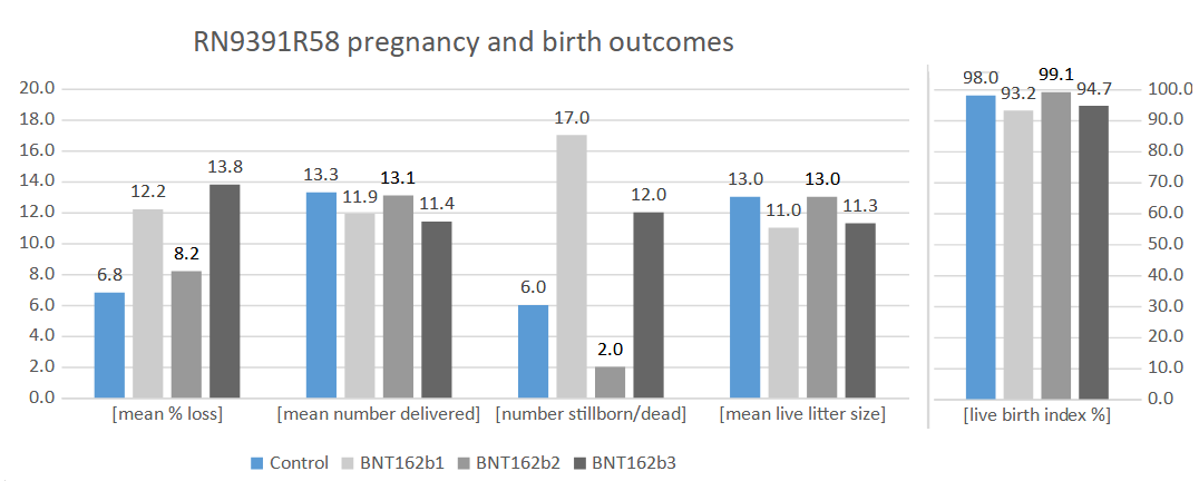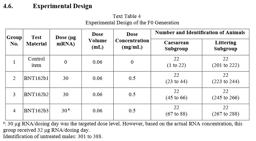 Now, I will say that I find animal testing unethical and am hesitant to write about it. But I do find human testing even more unethical, in particular if it is conducted at a global scale. Thus, let’s have a critical look at this Pfizer/BioNTech-funded study. They used Wistar lab rats divided into four groups, a control group and three vaccine groups to test three BioNTech vaccine candidates, BNT162b1, BNT162b2, and BNT162b3. Each group was further divided into a caesarean subgroup to study embryo development and a littering subgroup to study live pup development, with 22 female animals in each subgroup for a total of 178 female rats. The animals in the vaccine groups received four mRNA injections, two prior to mating (with untreated males) and two during gestation, while the controls received a saline solution.