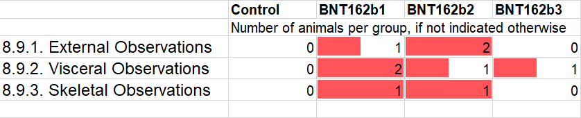 The health of the Wistar rat pups again gives reason for concern, as five out of seven indicators shown above are shifted towards issues in all vaccine groups. Again, I have selected indicators where I subjectively noticed a pattern based on multiple observations across multiple groups, whether there was a clear distinction between the control and the treatment arms or not. Specifically, these remaining observations are consistent between the vaccine candidate groups. If anything, the b1 group looks better than b2 and b3. This element does not give me much confidence in the selected b2 vaccine candidate, in particular since I am assuming that most of the ingredients of these concoctions are identical. In fact, the drug regulators should have known before approval how similar or different the BNT162b2 cocktail is to the two other, more deadly b1 and b3 recipes.